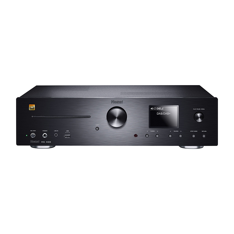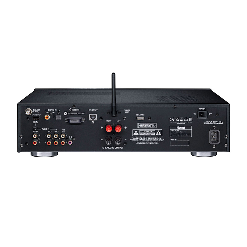 Il Magnat MC 400 è dotato di tutte le funzionalità necessarie per soddisfare gli amanti della musica. Dispone di sintonizzatore FM e DAB+, ingresso phono, connessioni analogiche come l’ingresso per cuffie, nonché ingressi digitali, ottici e coassiali. L’MC 400 offre anche una connessione HDMI, che ne consente l’utilizzo come straordinario upgrade audio per tutte le sorgenti TV.