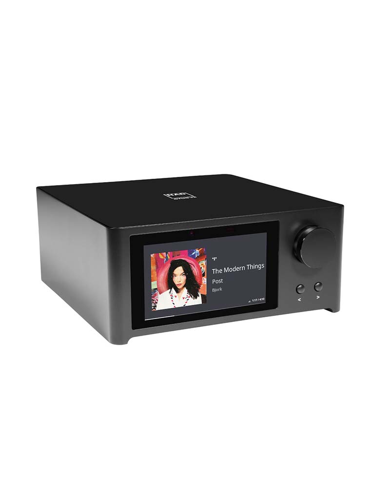 Il compatto ed elegante alloggiamento in alluminio ospita due amplificatori HybridDigital UCD e uno streamer di rete compatibile con BluOS. Sul pannello frontale è presente un display a colori da 12,7 cm che mostra la copertina dell’album, la traccia corrente e le impostazioni di sistema.