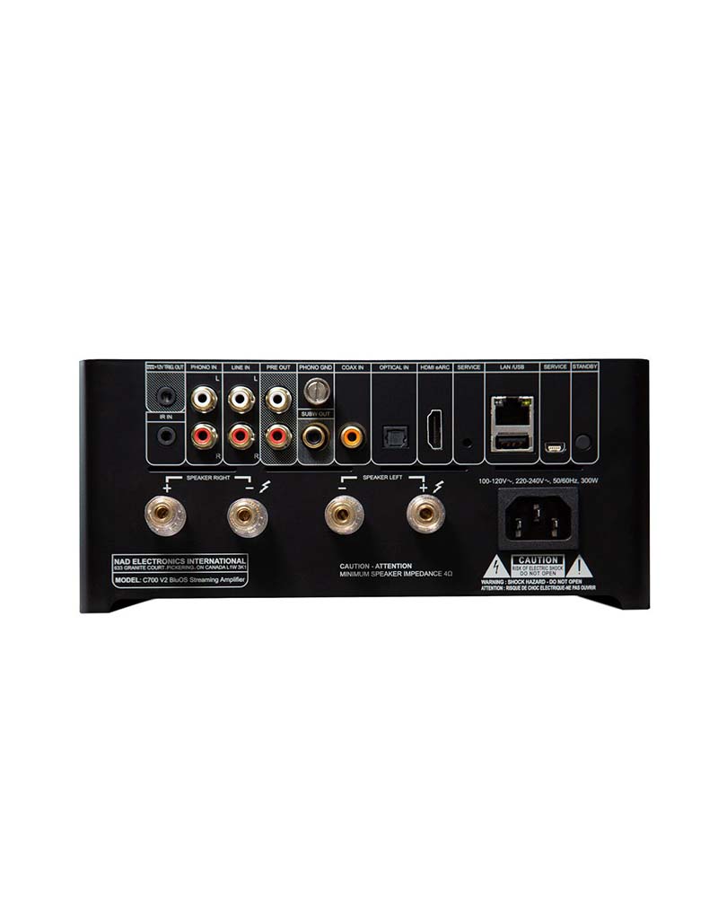 Gli altoparlanti collegati hanno una potenza continua di 2 x 80 watt (8 O) o 2 x 100 watt (4 O). Il C 700 V2 è inoltre dotato di un’uscita subwoofer configurabile tramite l’app BluOS. Le impostazioni passa-basso e passa-alto consentono una transizione fluida tra il subwoofer e gli altoparlanti principali.